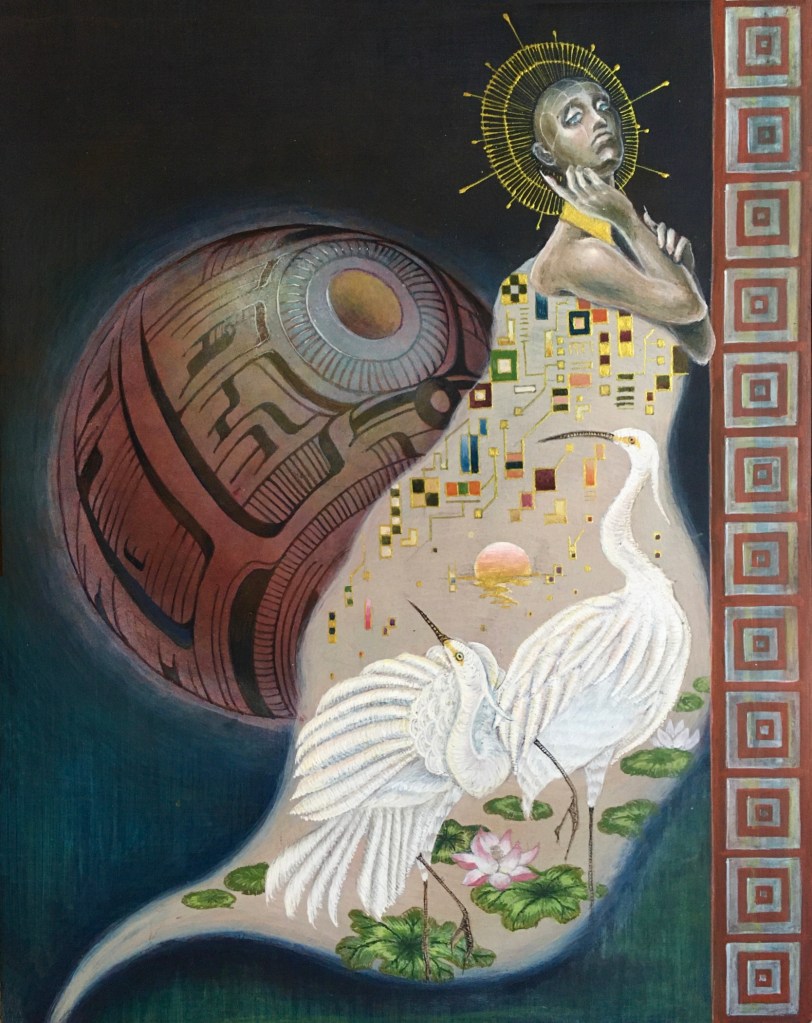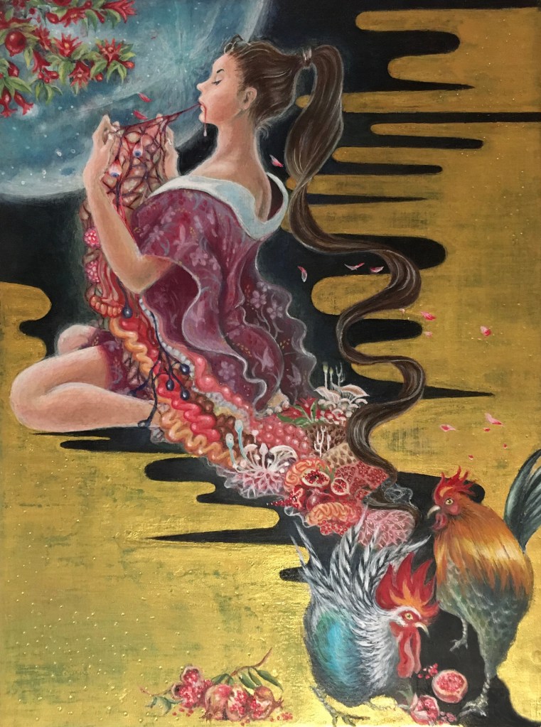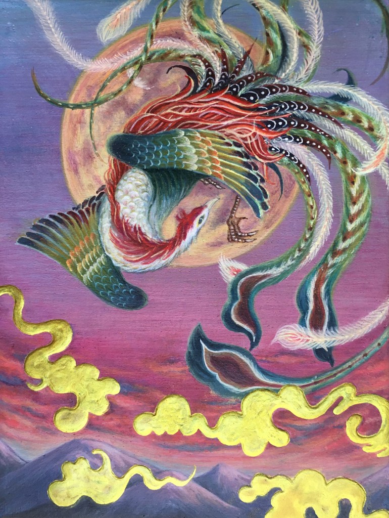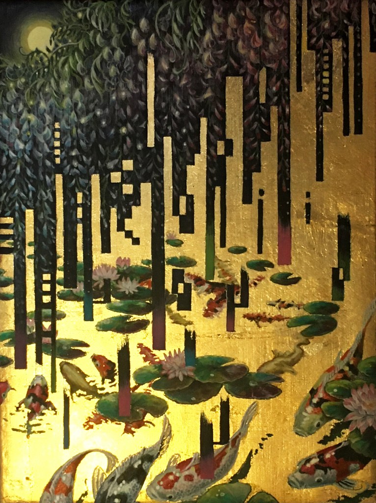 This series is inspired by the moon as a universal motif. Drawing from Asian visual culture and mythology, the works explore emotional energy and the human impulse to create stories through layered imagery and the symbolic use of gold.