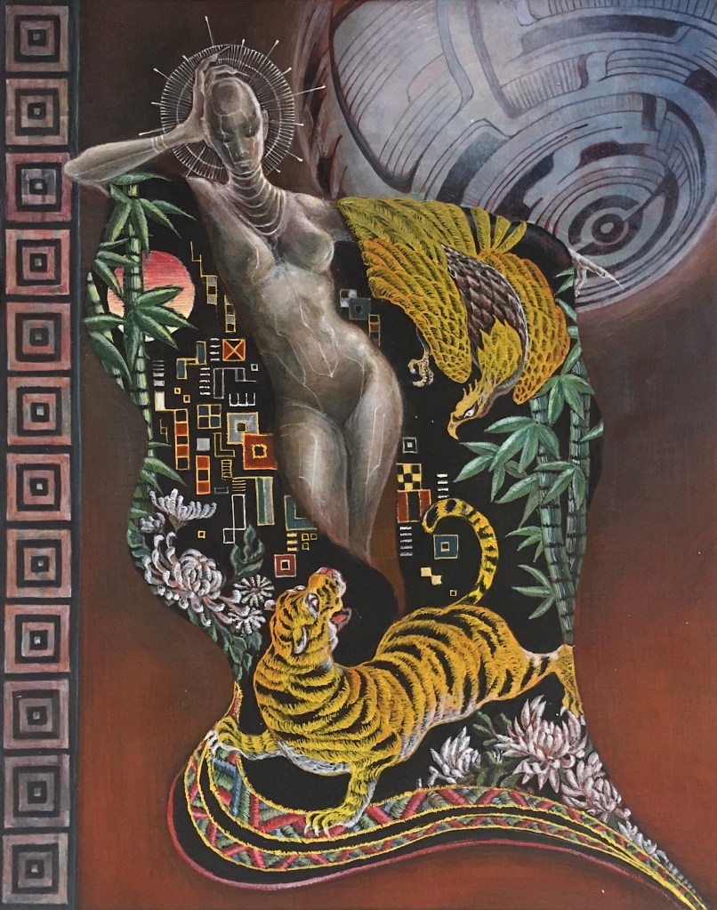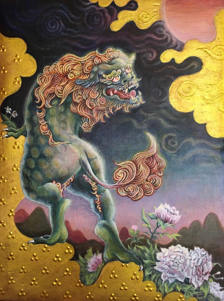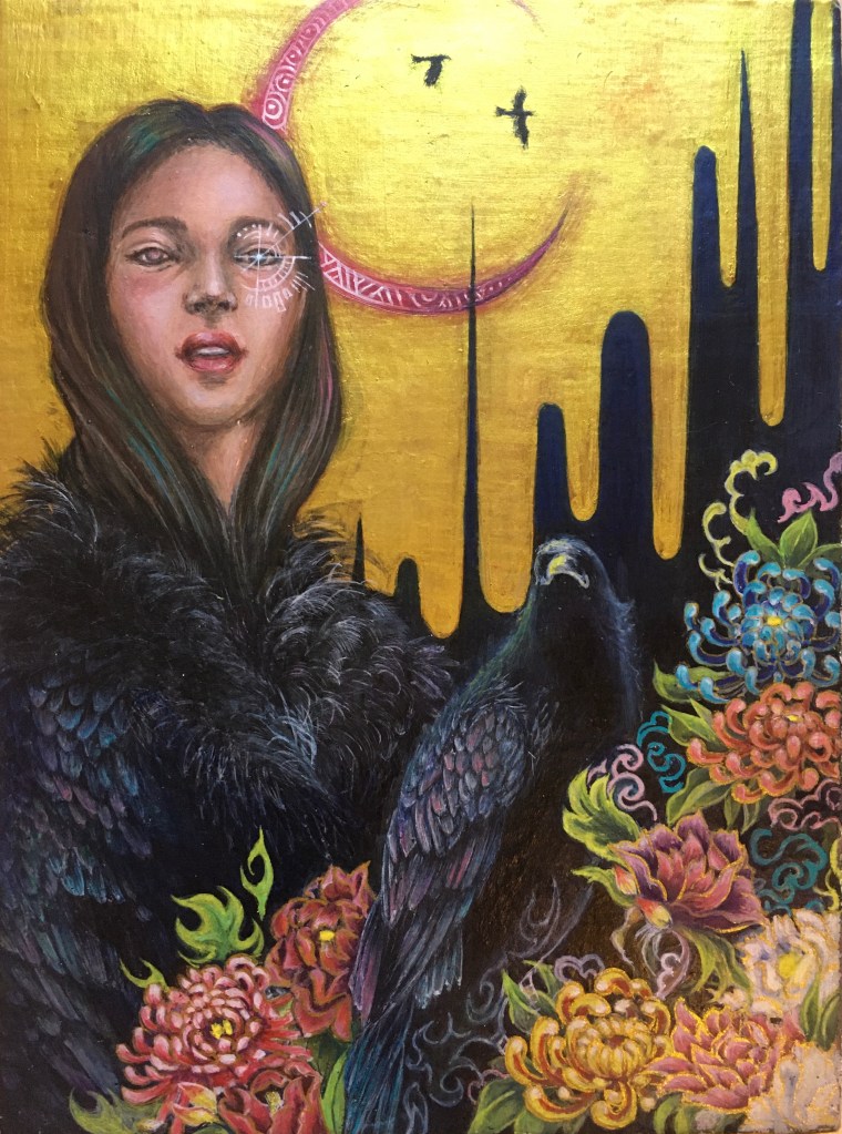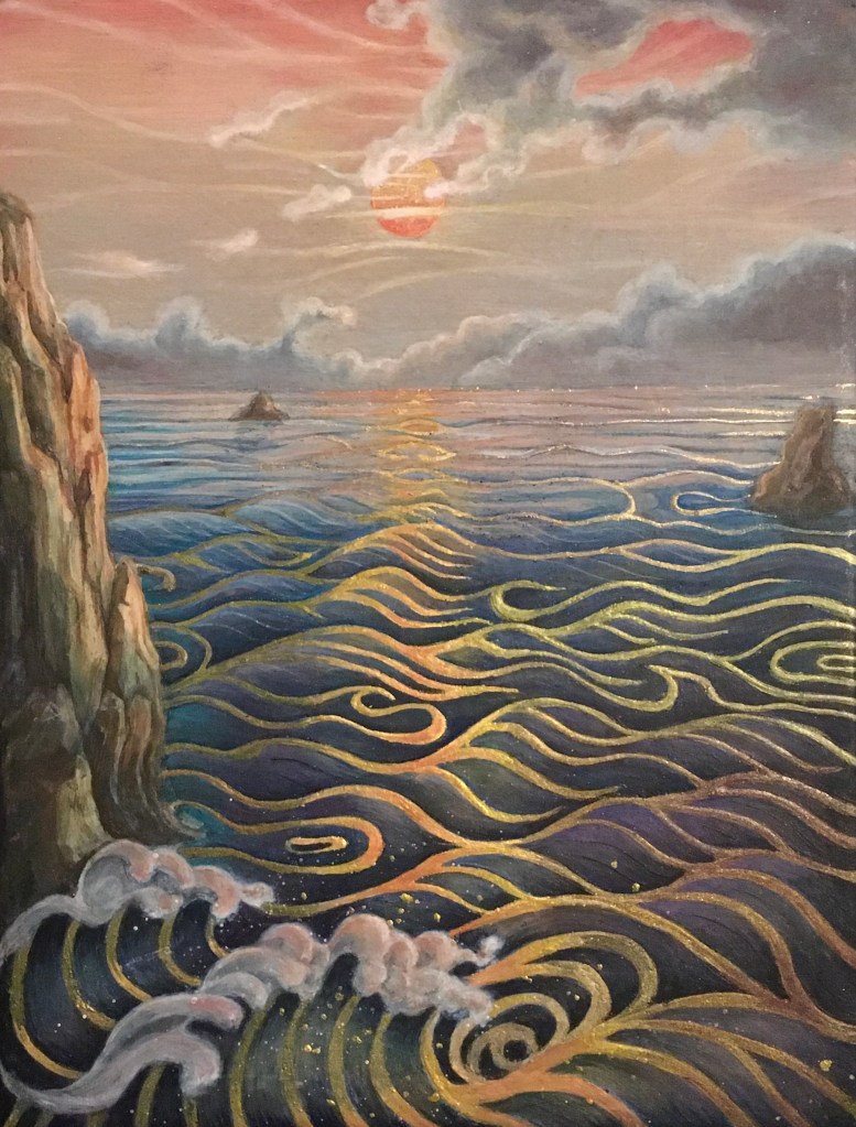 This series is inspired by the moon as a universal motif. Drawing from Asian visual culture and mythology, the works explore emotional energy and the human impulse to create stories through layered imagery and the symbolic use of gold.